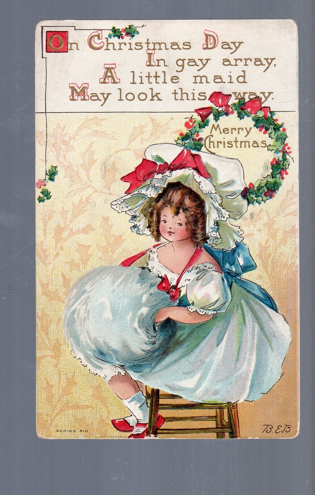YA370 Antique Postcard Christmas signed Bertha Blodgett girl on stool 1913