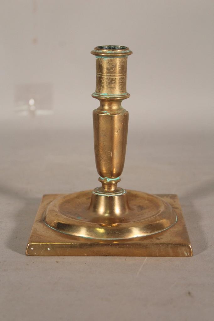 RARE 17TH C SPANISH SQUARE BASE FACETED STEM BRASS BELL METAL CANDLESTICK