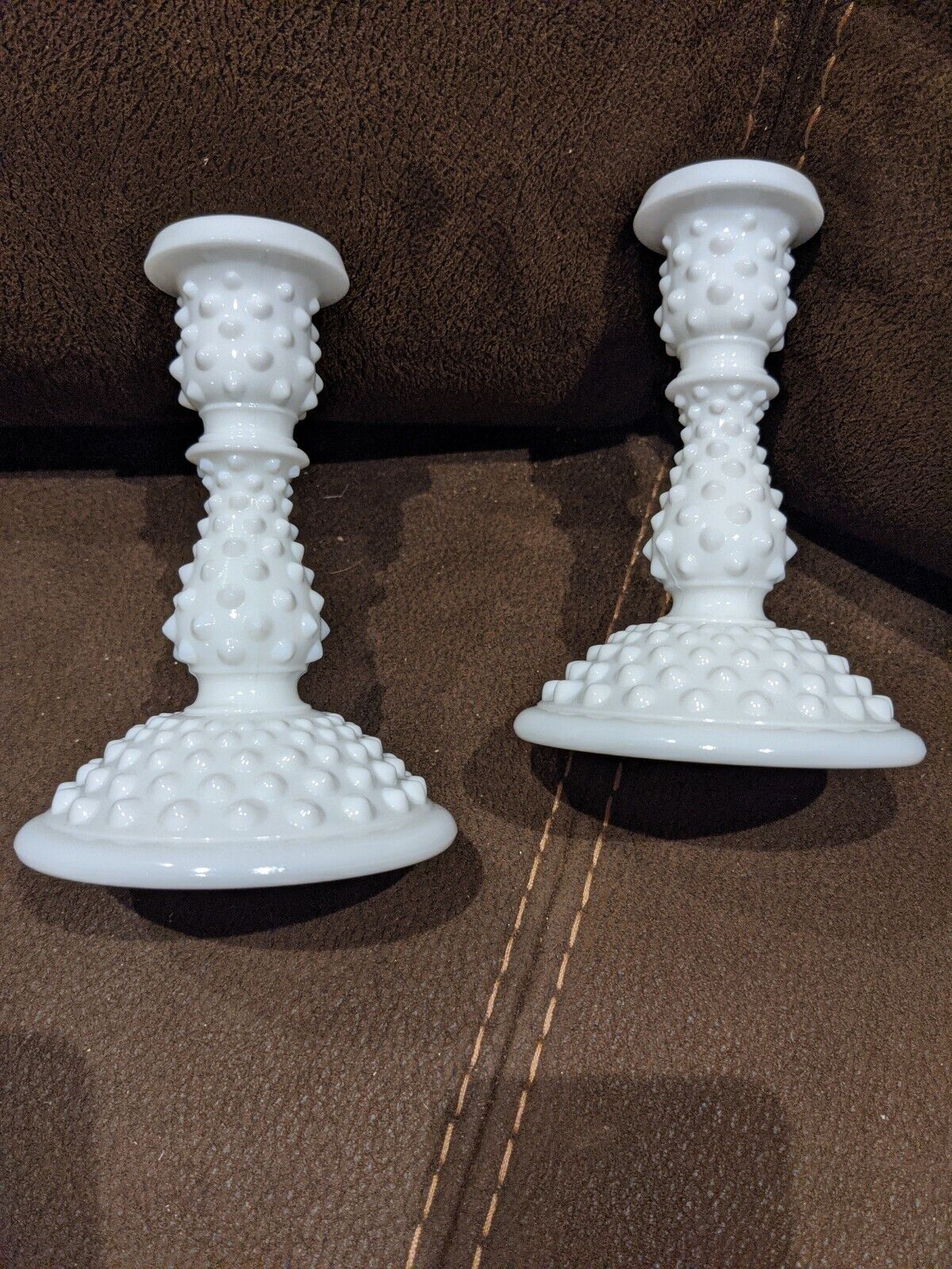 Title (ebay affiliate link): Vintage FENTON White Milk Glass Hobnail Pair Candlesticks 634 Candle Holders