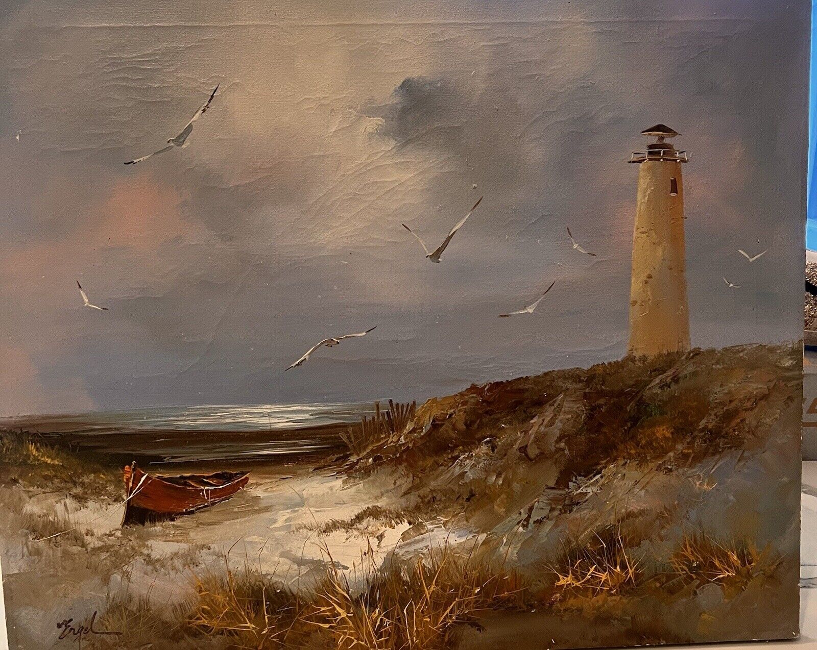 Engel Art Lighthouse Seascape Oil on Canvas Signed 24” X 20”