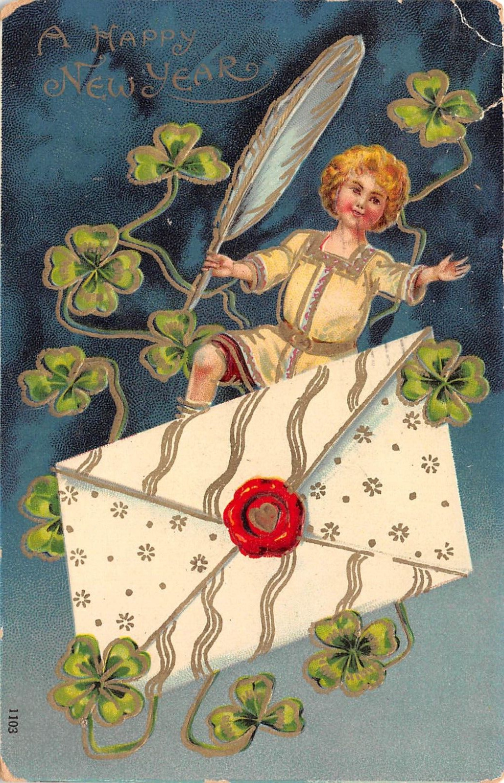 Title (ebay affiliate link): C9028 A Happy New Year Child Envelope 4 Leaf Clovers Antique Postcard Emb. 1103