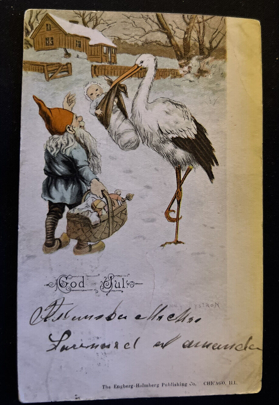 Elf or Gnome in Snow with Baby Stork Antique 1904 Postcardc82