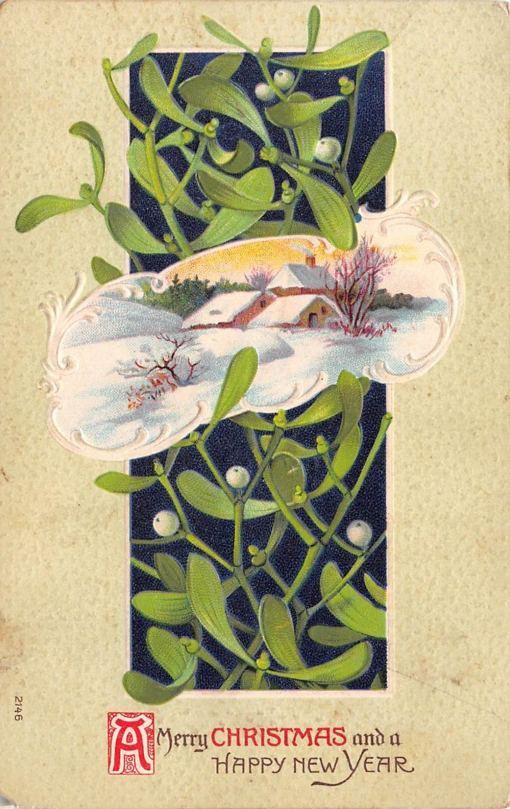 C9006 Merry Xmas Happy New Year Winter View Mistletoe Antique Postcard Emb.