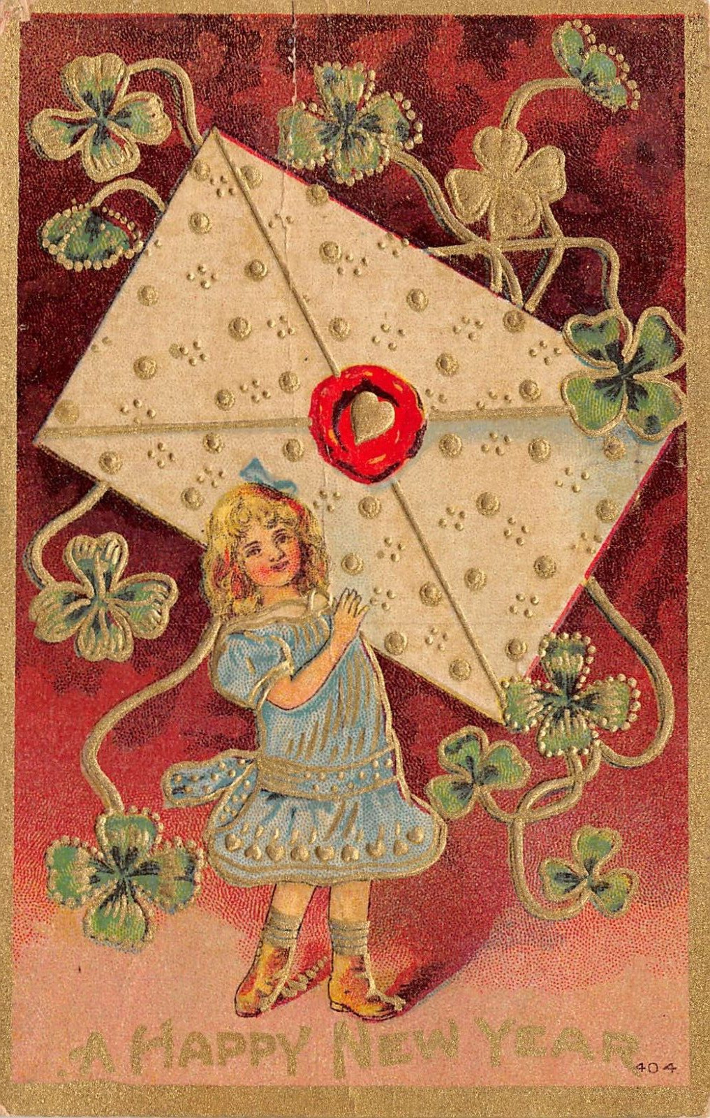 Title (ebay affiliate link): C9029 Happy New Year Girl Envelope 4 Leaf Clovers Antique Postcard Emb. Ser. 404