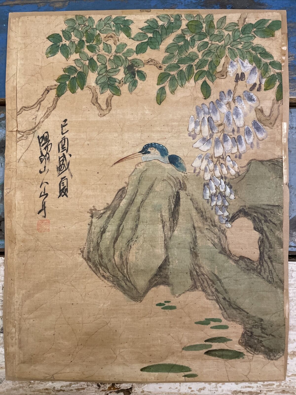 ANTIQUE JAPANESE WATERCOLOR INK PAINTING RICE PAPER WISTERIA FLOWERS BIRD ROCK