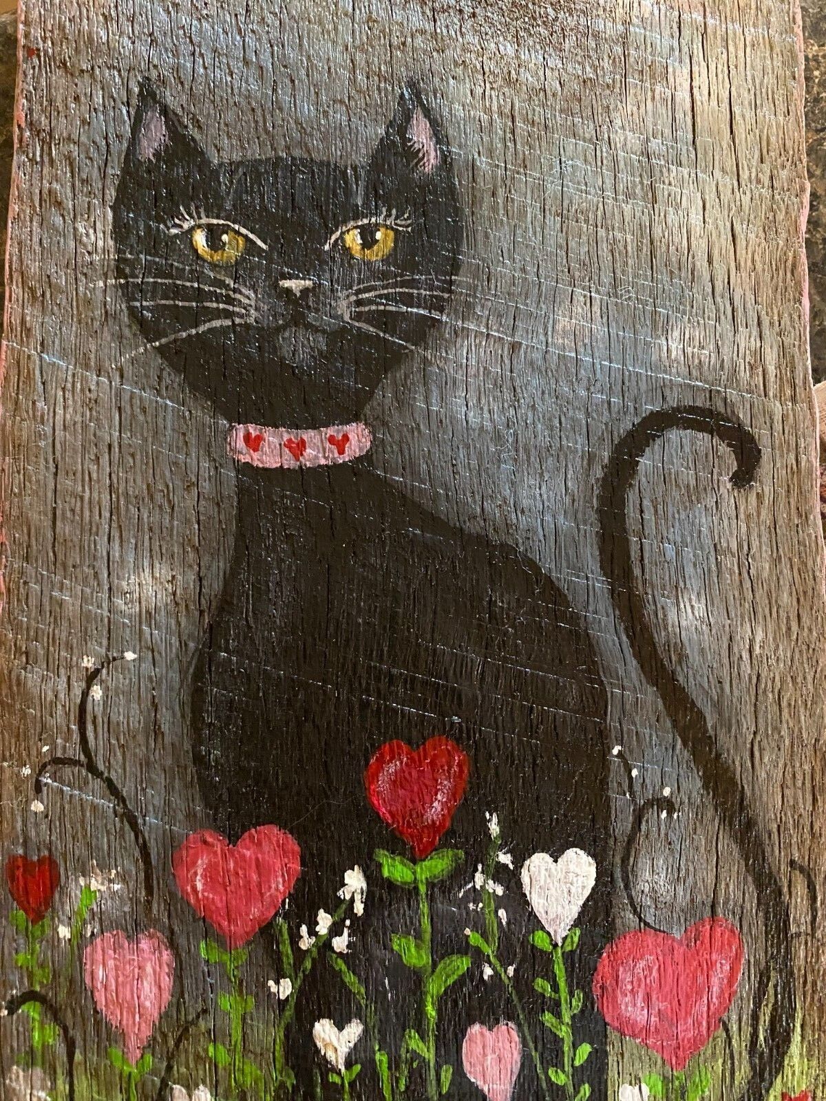 Title (ebay affiliate link): PRIMITIVE FOLK ART PRIM HP VALENTINE BLACK CAT RECYCLED RECLAIMED BARN WOOD