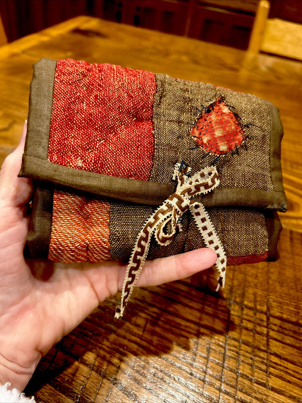 Title (ebay affiliate link): Primitive Pin Keep made fm Early Brown Red Linsey Woolsey Quilt Calico Patch