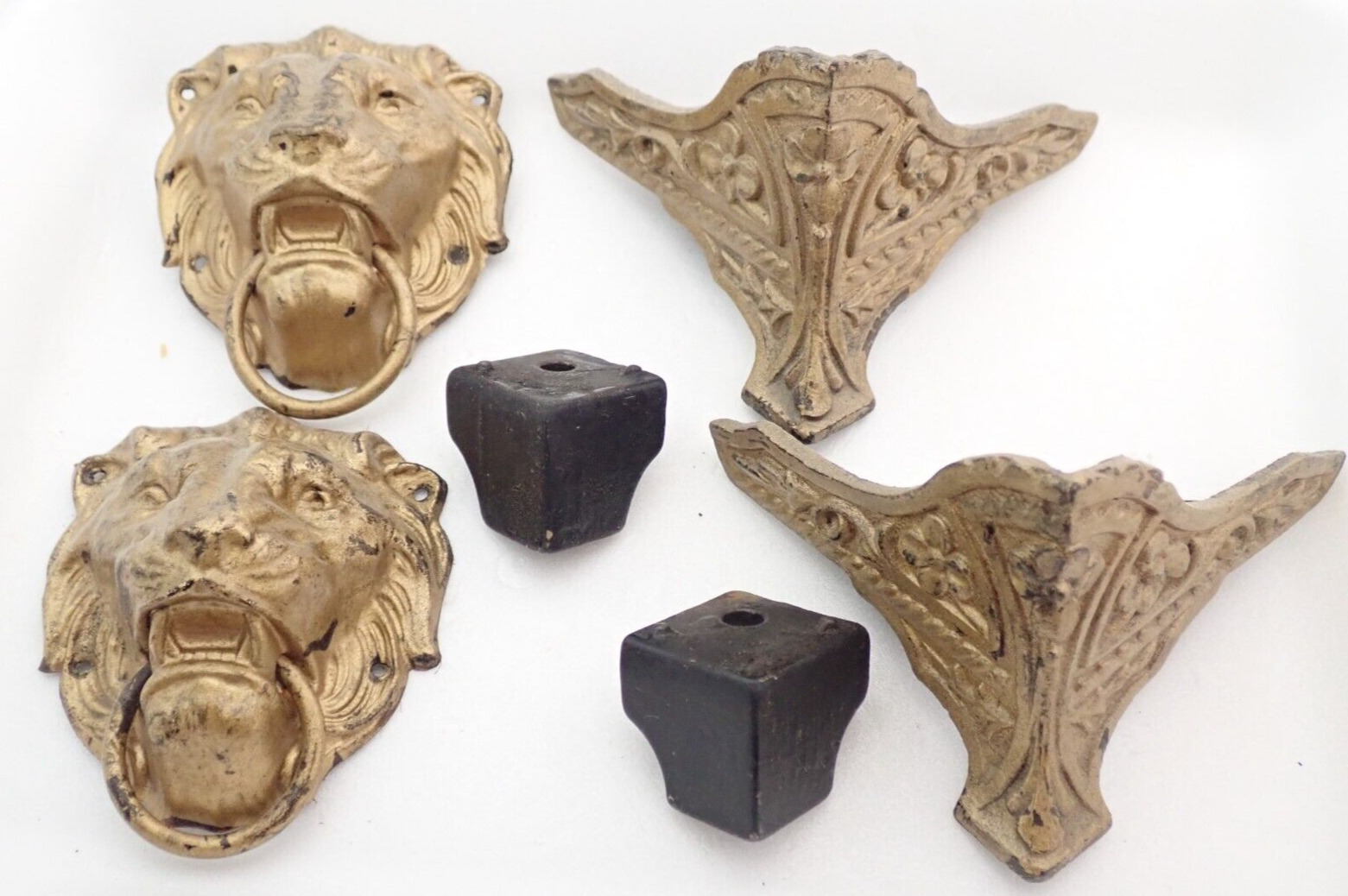 LOT SET OF ANTIQUE MANTEL SHELF CLOCK FEET LION HEAD SIDE TRIM PARTS REPAIR