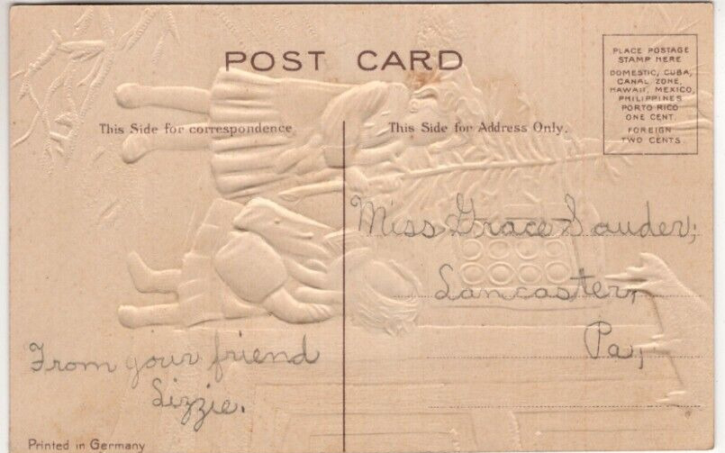 ANTIQUE EMBOSSED CHRISTMAS Postcard TWO YOUNG GIRLS AT DOORWAY HOLDING TREE