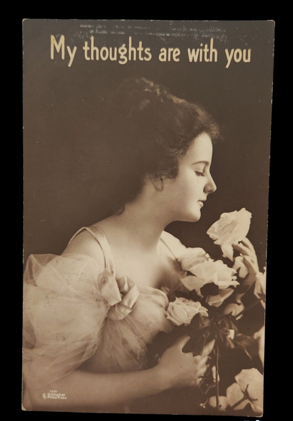 Vintage Early Antique 1916 Postcard RPPC Real Photo Woman Smelling Roses
