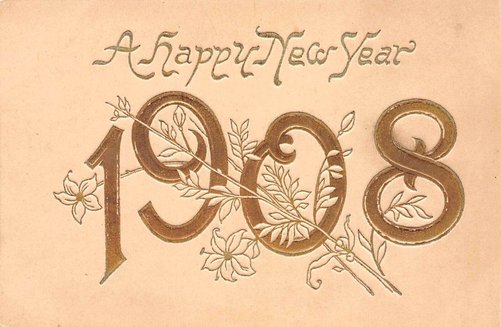 C9039 34A Happy New Year34 Gold 1908 Flowers Antique Holiday Postcard Embossed