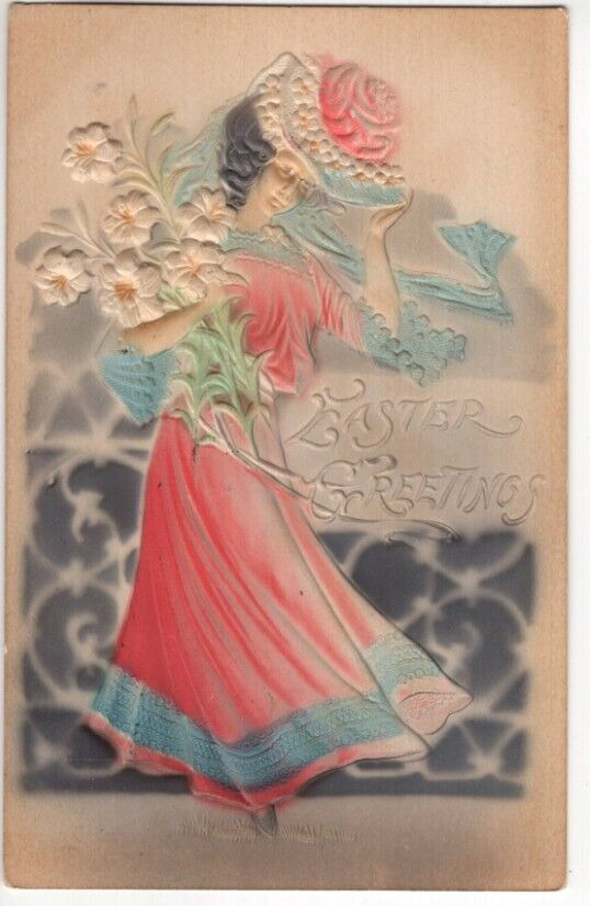ANTIQUE EMBOSSED EASTER Postcard LADY HOLDING ONTO HER HAT ON WINDY DAY