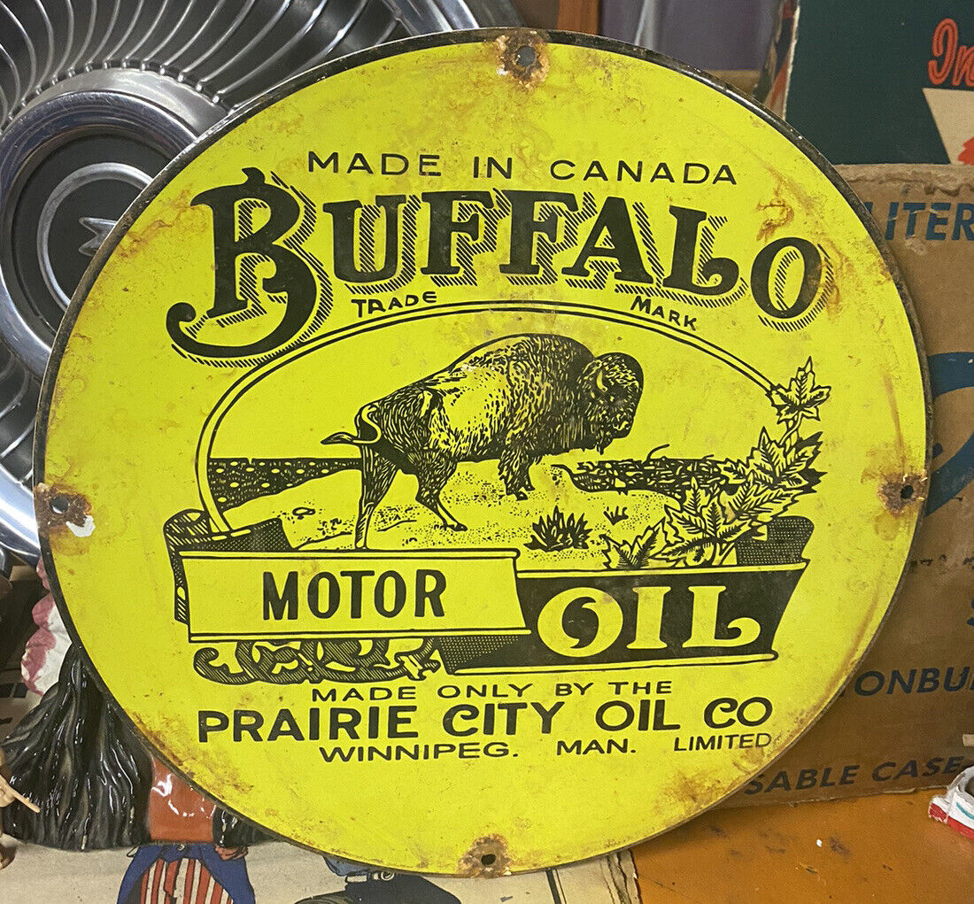 12” CANADIAN BUFFALO MOTOR OIL PRAIRIE CITY OIL GAS PUMP STATION PORCELAIN SIGN
