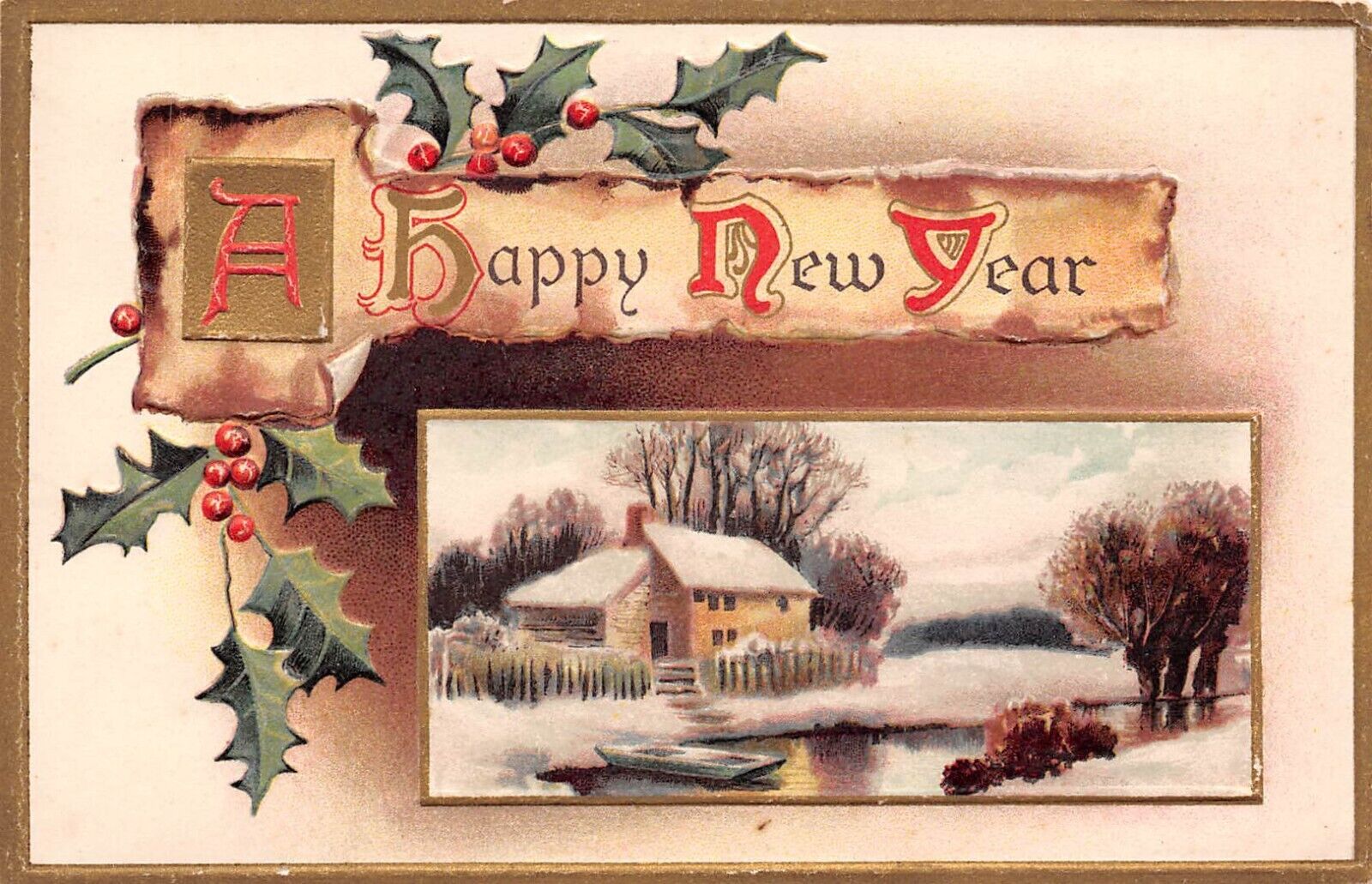 C9050 34A Happy New Year34 Rural View Holly Antique Holiday Postcard Embossed