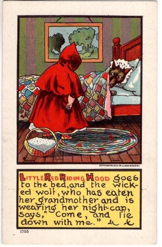Title (ebay affiliate link): ANTIQUE ART Postcard LITTLE RED RIDING HOOD 34COME AND LIE DOWN WITH ME34