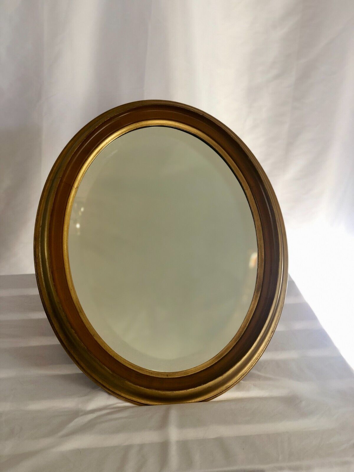 Title (ebay affiliate link): beautiful vintage hanging wall mirror 19 x 15 oval shaped metallic gold