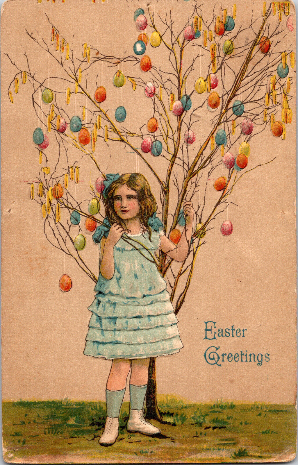 Title (ebay affiliate link): Antique Easter Greeting Postcard Embossed Girl in Blue Dress Eggs in Tree