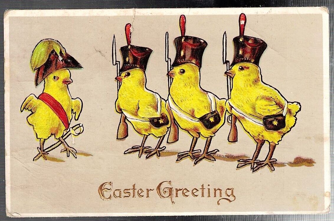 ANTIQUE 1911 EASTER GREETING 4 BABY CHICKS DRESSED AS SOLDIERS HOLIDAY POSTCARD
