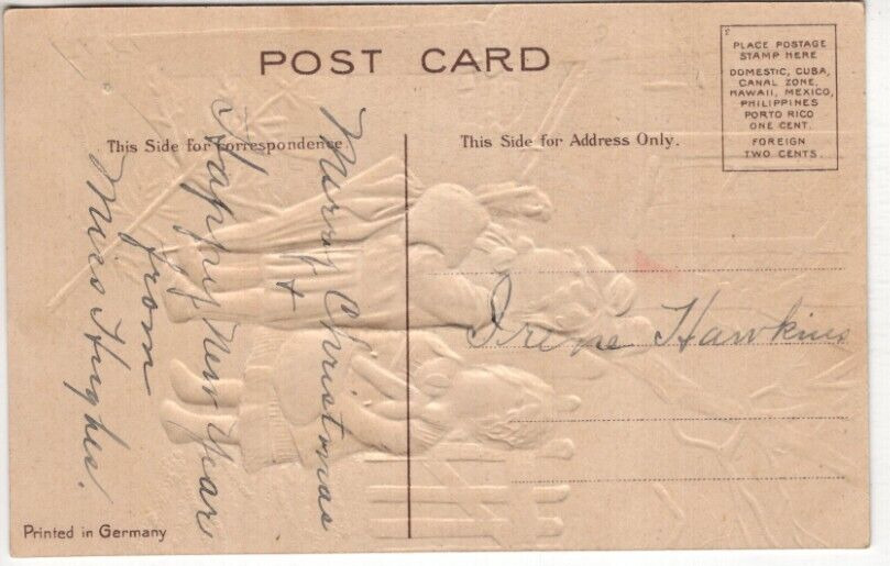 Title (ebay affiliate link): ANTIQUE EMBOSSED CHRISTMAS Postcard TWO YOUNG GIRLS NEAR HOUSE UMBRELLA