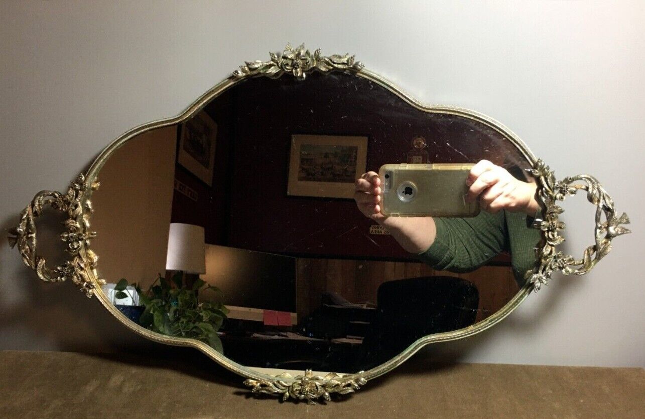Antique Vanity Mirror with handles Long Quatrefoil Shape Bronze Ornate Birds