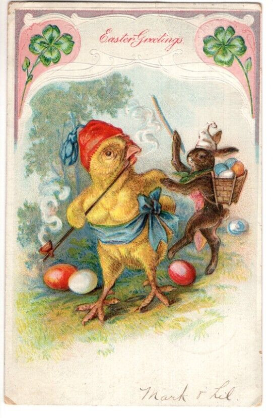 Title (ebay affiliate link): 1907 ANTIQUE EMBOSSED EASTER Postcard DRESSED CHICK AND DRESSED BUNNY DANCING
