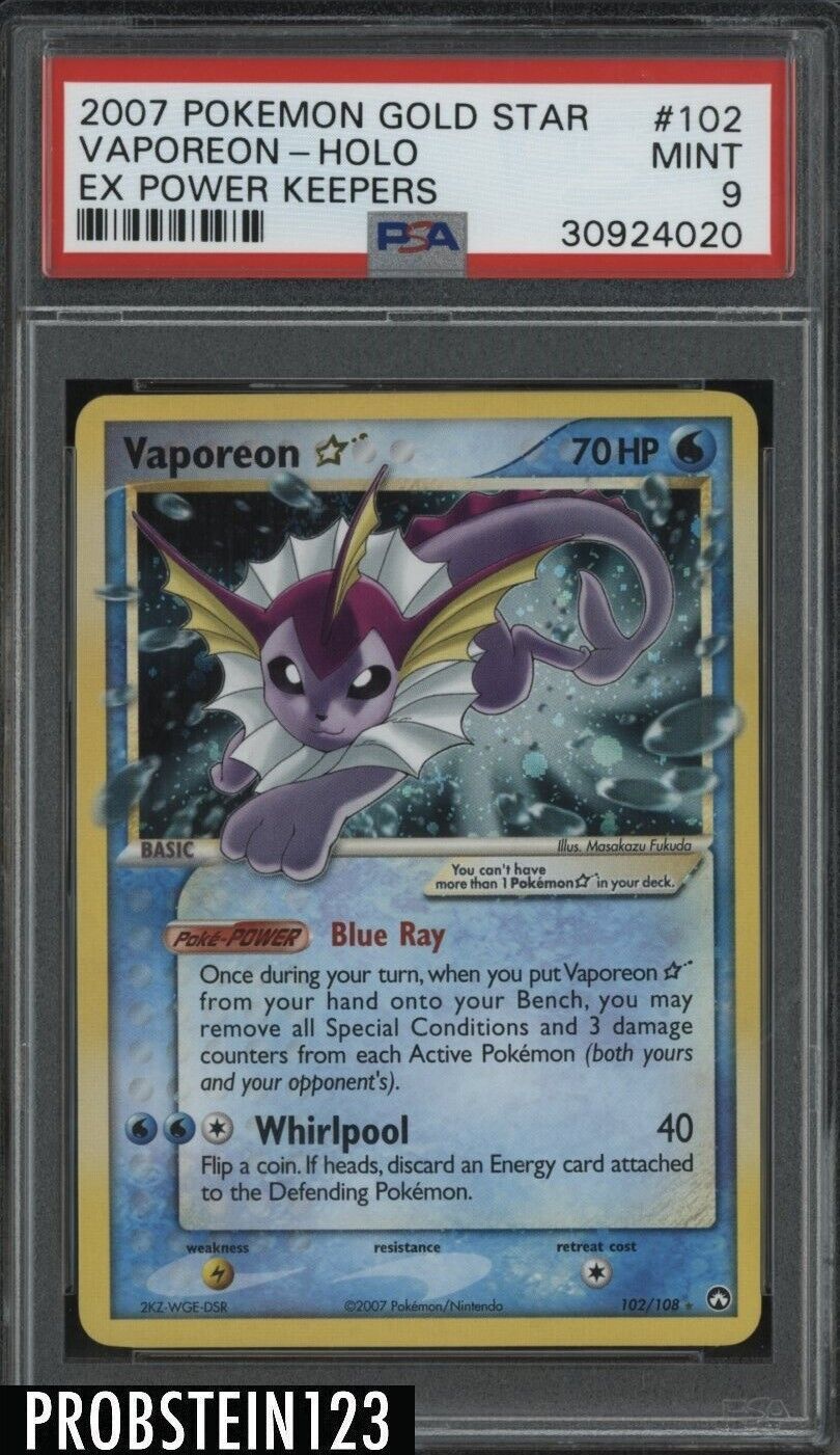 Title (ebay affiliate link): 2007 Pokemon Ex Power Keepers Vaporeon Gold StarHolo 102 PSA 9 MINT