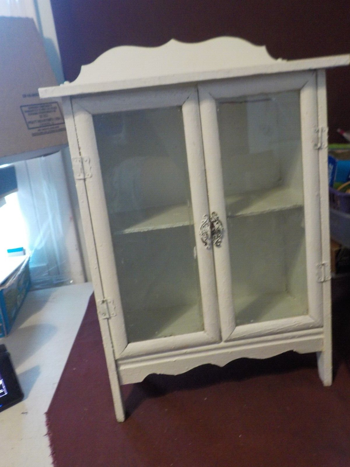 Title (ebay affiliate link): ANTIQUE SMALL WHITE PAITNED WOODEN CABINET WITH GLASS DOORS