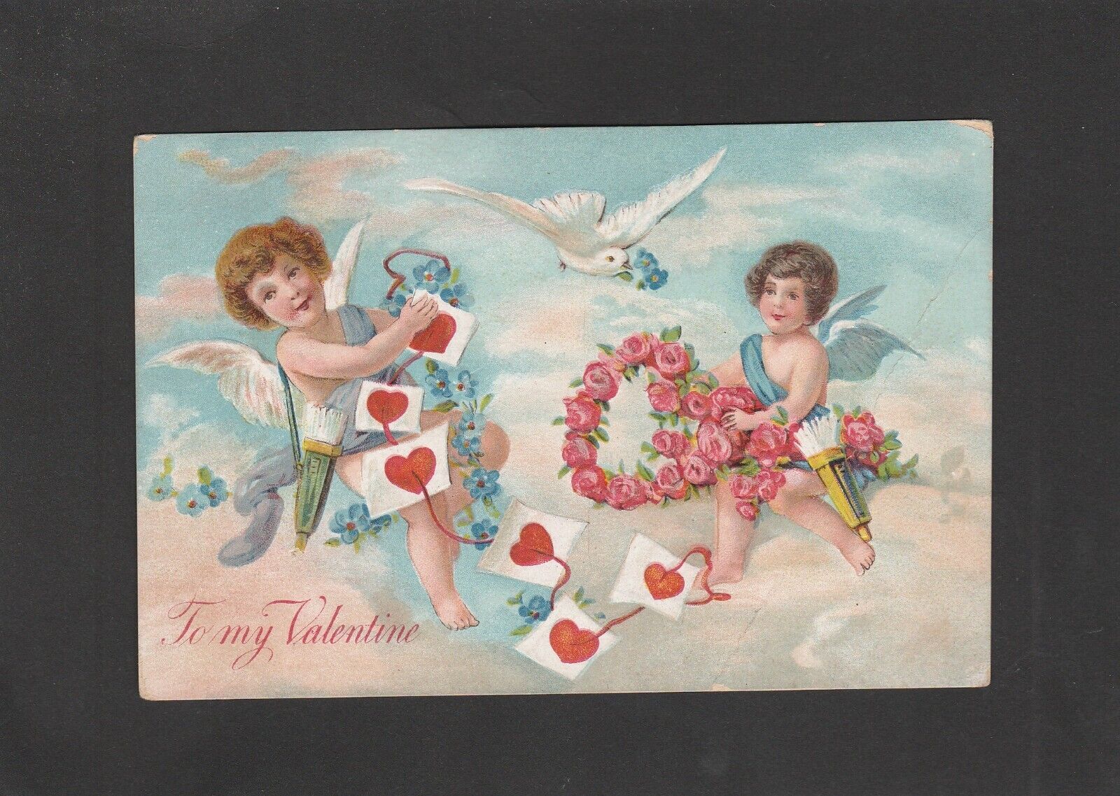 Valentine Two Angel Cupids Hearts Dove Flowers Vintage Embossed Postcard