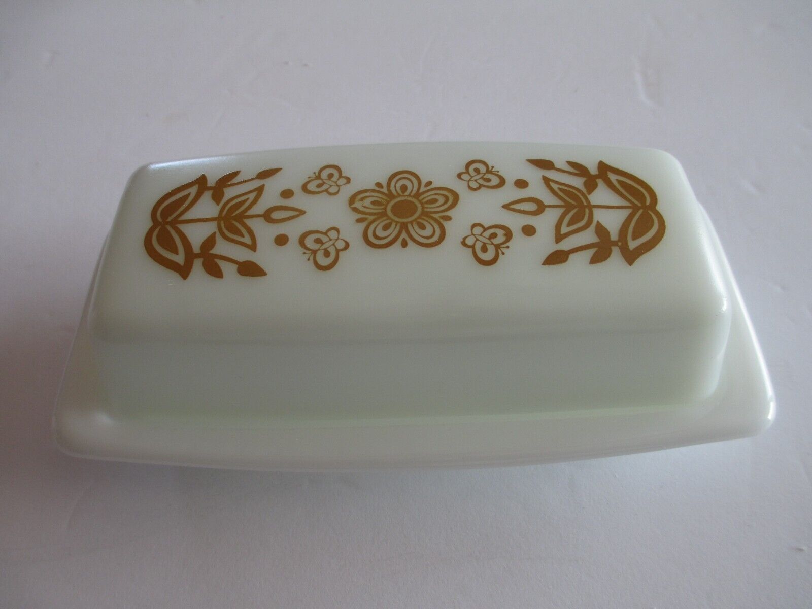 Title (ebay affiliate link): Vintage Pyrex Butter Dish Oven Ware 72B Gold Flowers Butterflys Nice Condition