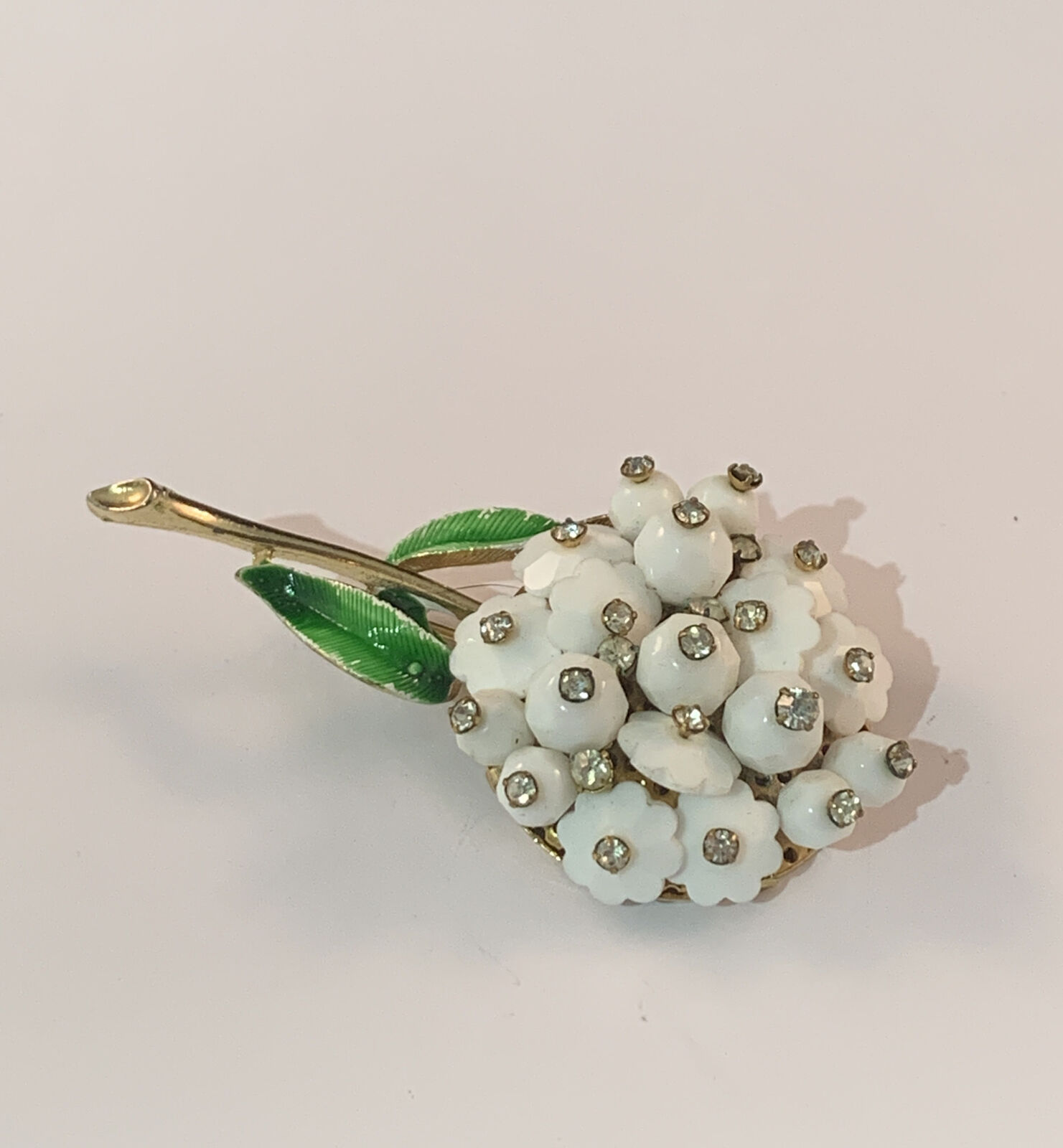 Title (ebay affiliate link): Vintage Gold Tone Milk Glass Rhinestone Enamel Flower Cluster Brooch Pin P51