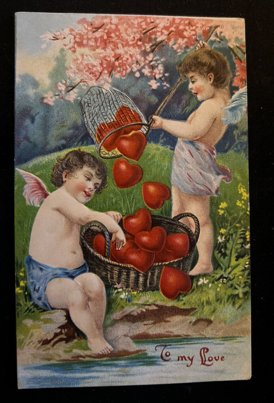 Title (ebay affiliate link): ValentinePretty Cupids with Basket of HeartsFlowers Antique Postcardc386