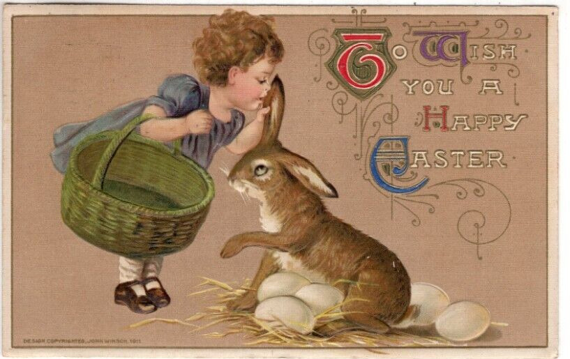 Title (ebay affiliate link): ANTIQUE EASTER Postcard JOHN WINSCH YOUNG GIRL KISSING BUNNYS EAR