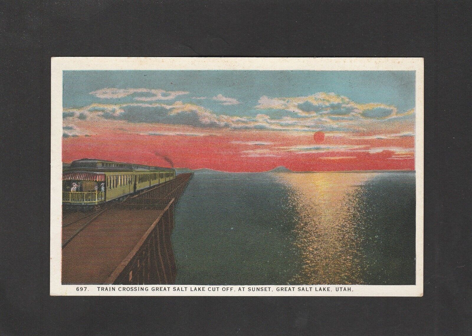 Title (ebay affiliate link): Train Crossing Great Salt Lake Cut Off Salt Lake City Utah UT Vintage Postcard