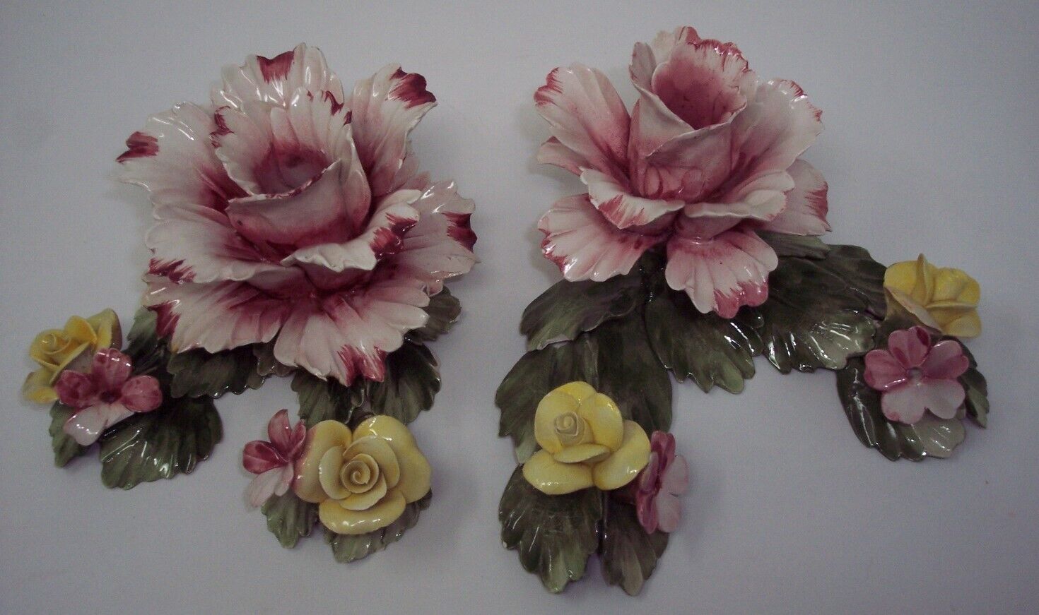 2 LARGER CAPODIMONTE CANDLE HOLDERS ITALY PINK YELLOW ROSES