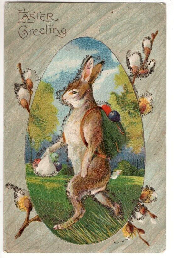 Title (ebay affiliate link): ANTIQUE EMBOSSED EASTER Postcard BUNNY WALKING WEARING BACKPACK