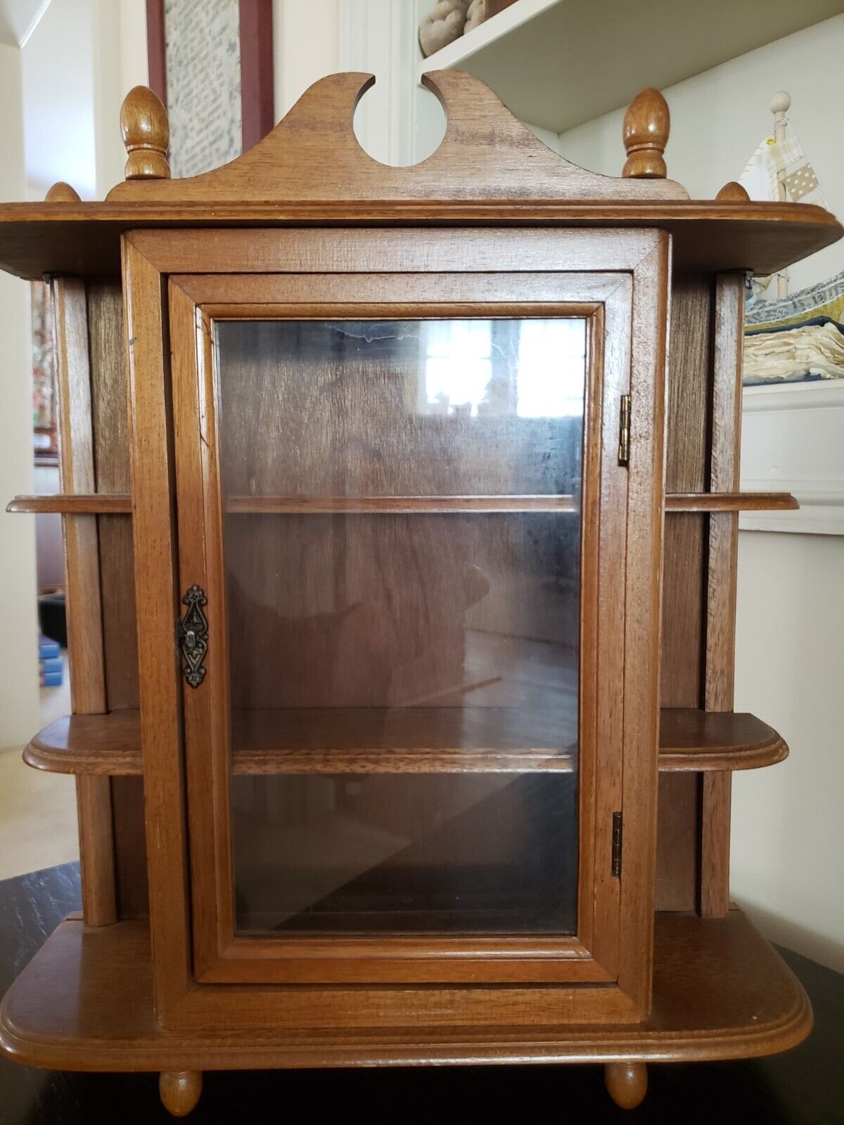 Title (ebay affiliate link): Vintage 16” Wood Glass Door Table Top Wall Hanging Display Curio Cabinet 3 Shelf