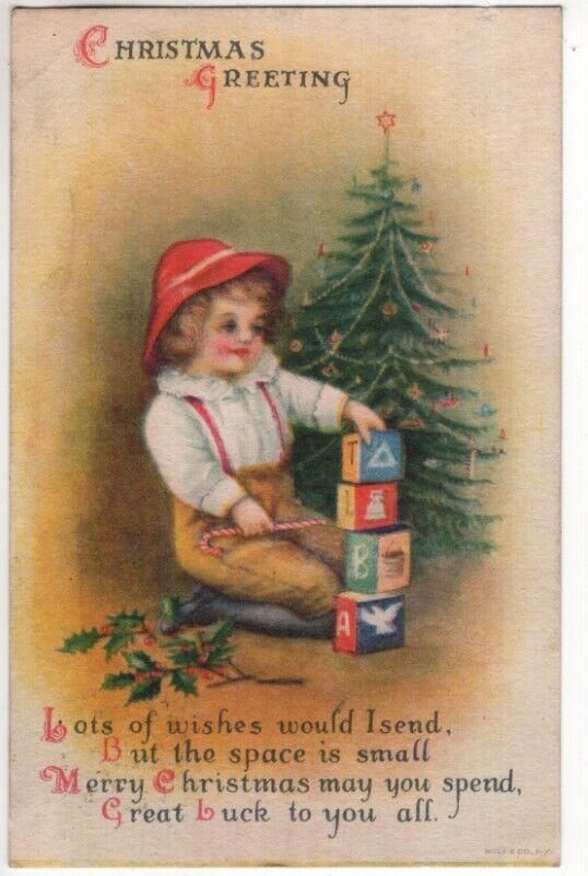 Title (ebay affiliate link): ANTIQUE CHRISTMAS Postcard YOUNG BOY PLAYING WITH BUILDING BLOCKS