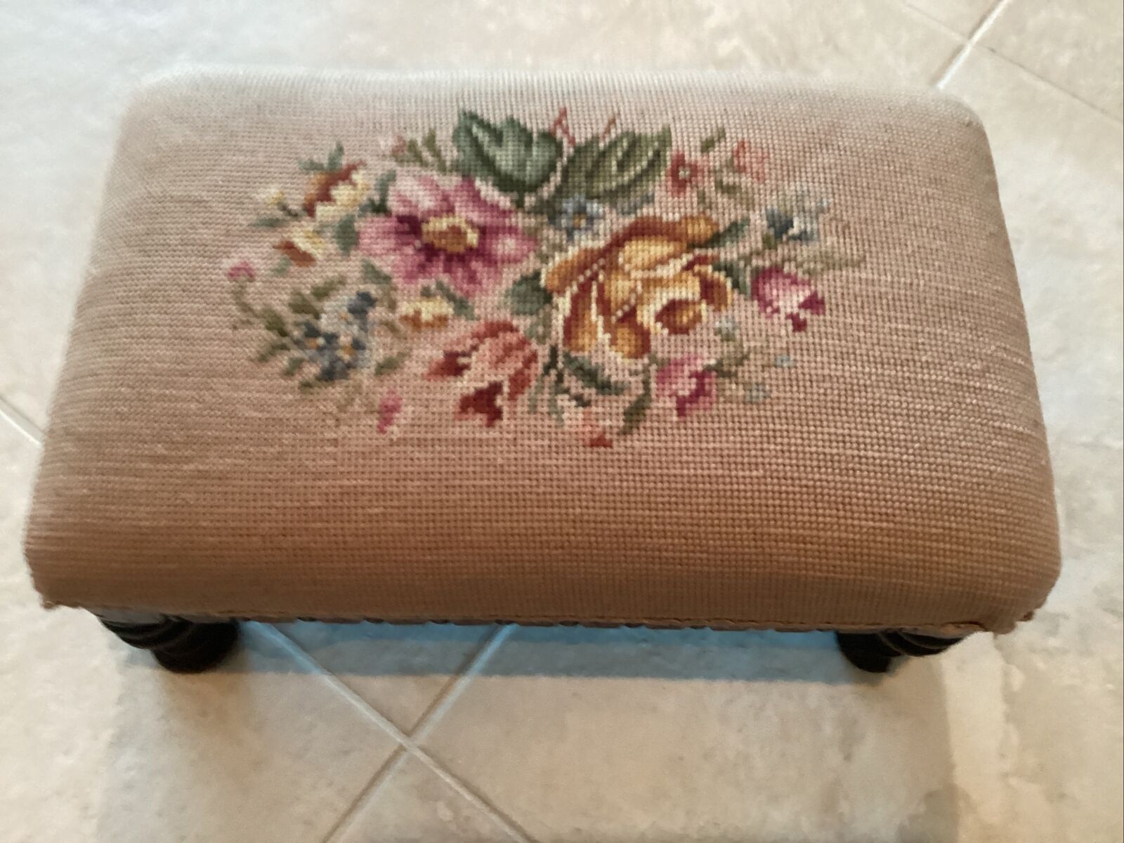 Vintage Wood Foot Step Stool Needlepoint Floral Seat 1634 x 1034 x 7