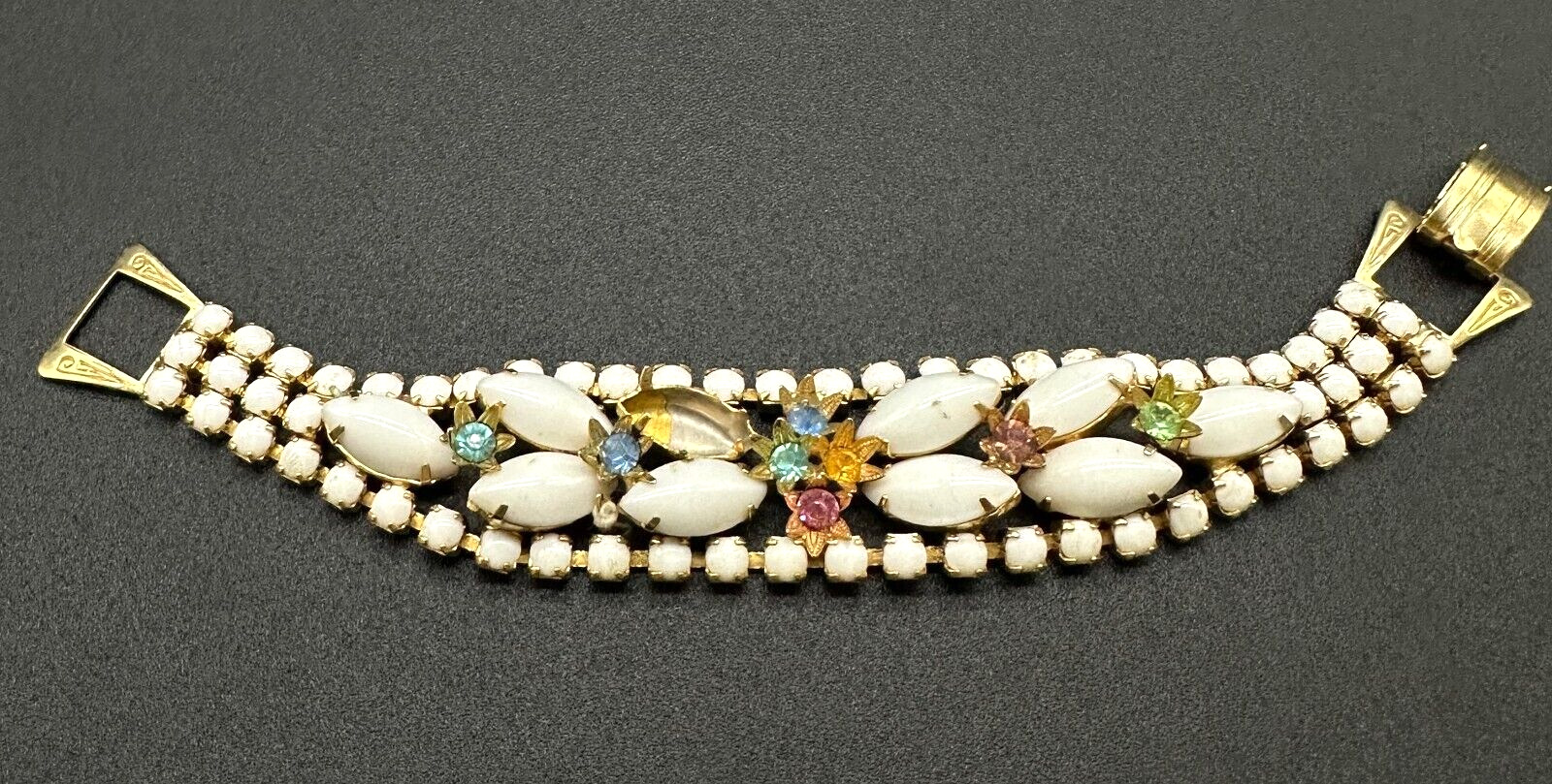 Title (ebay affiliate link): Vtg Juliana ? Gold Tone Milk Glass Flower Bracelet 7 1/434 Repair J01