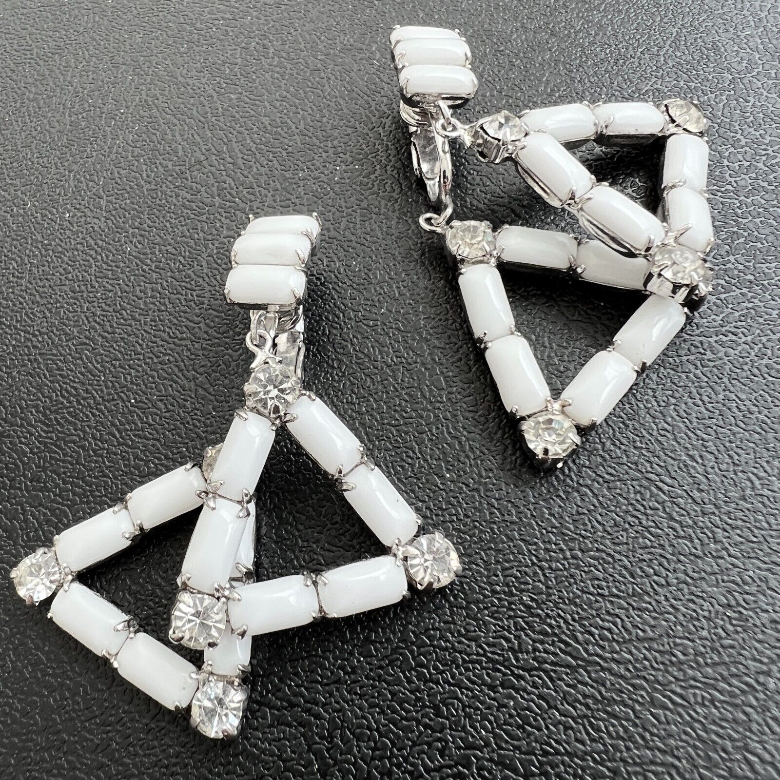Title (ebay affiliate link): A294 Vintage Triangle Milk Glass Geometric Crystal 1950s Silver Clip Earrings