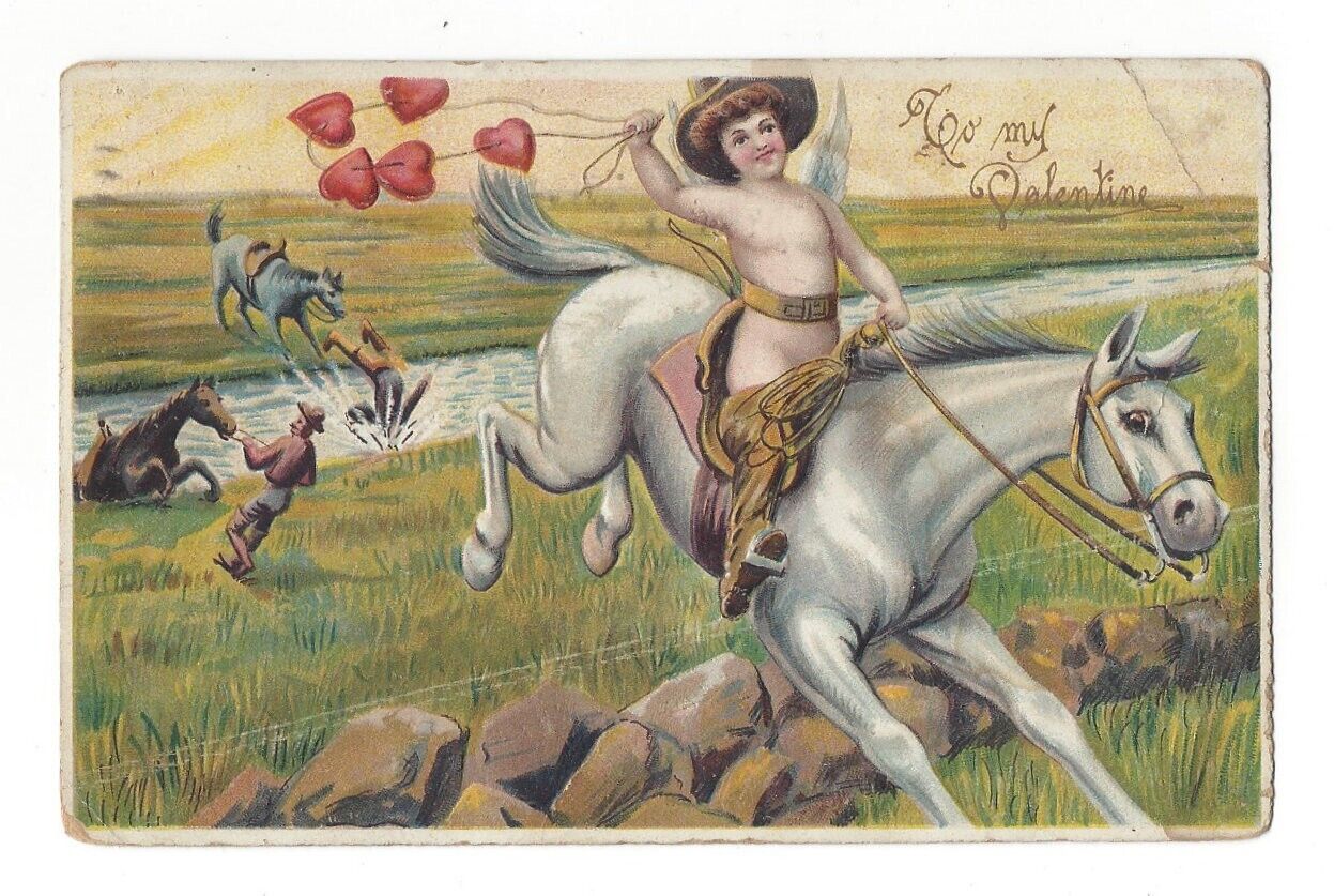 VINTAGE ANTIQUE 1909 VALENTINE EMBOSSED POSTCARD CUPID ON HORSE