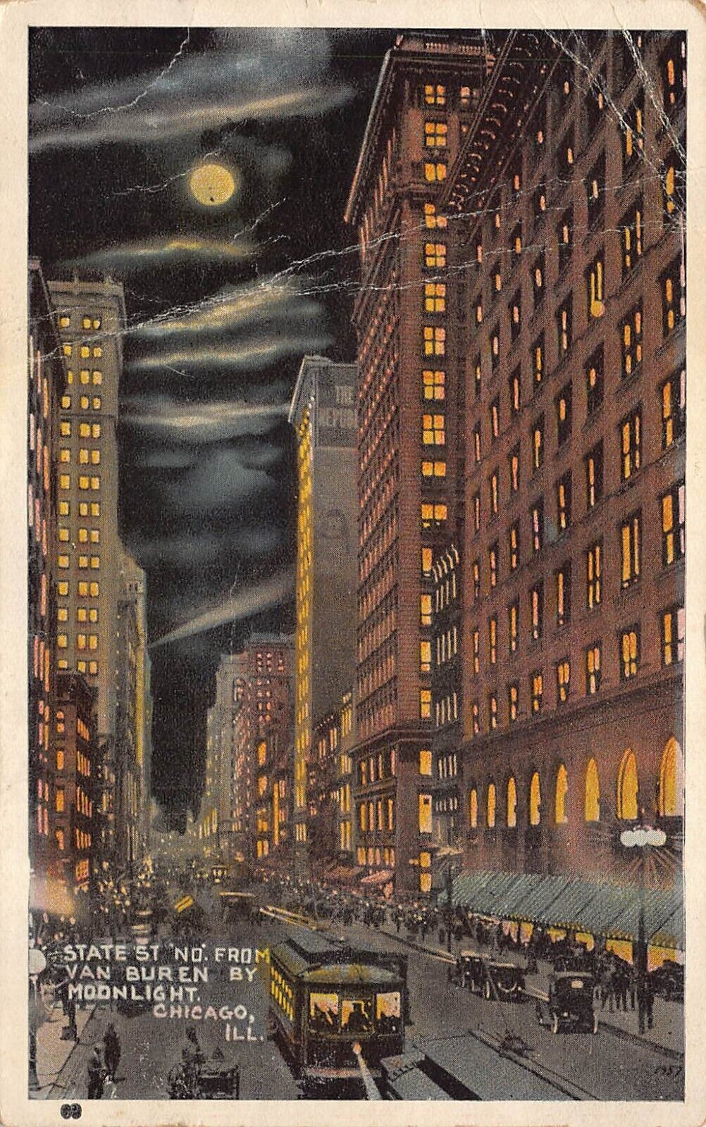 Chicagos State Street at Night full moon ca 1930 Antique unused POSTCARD