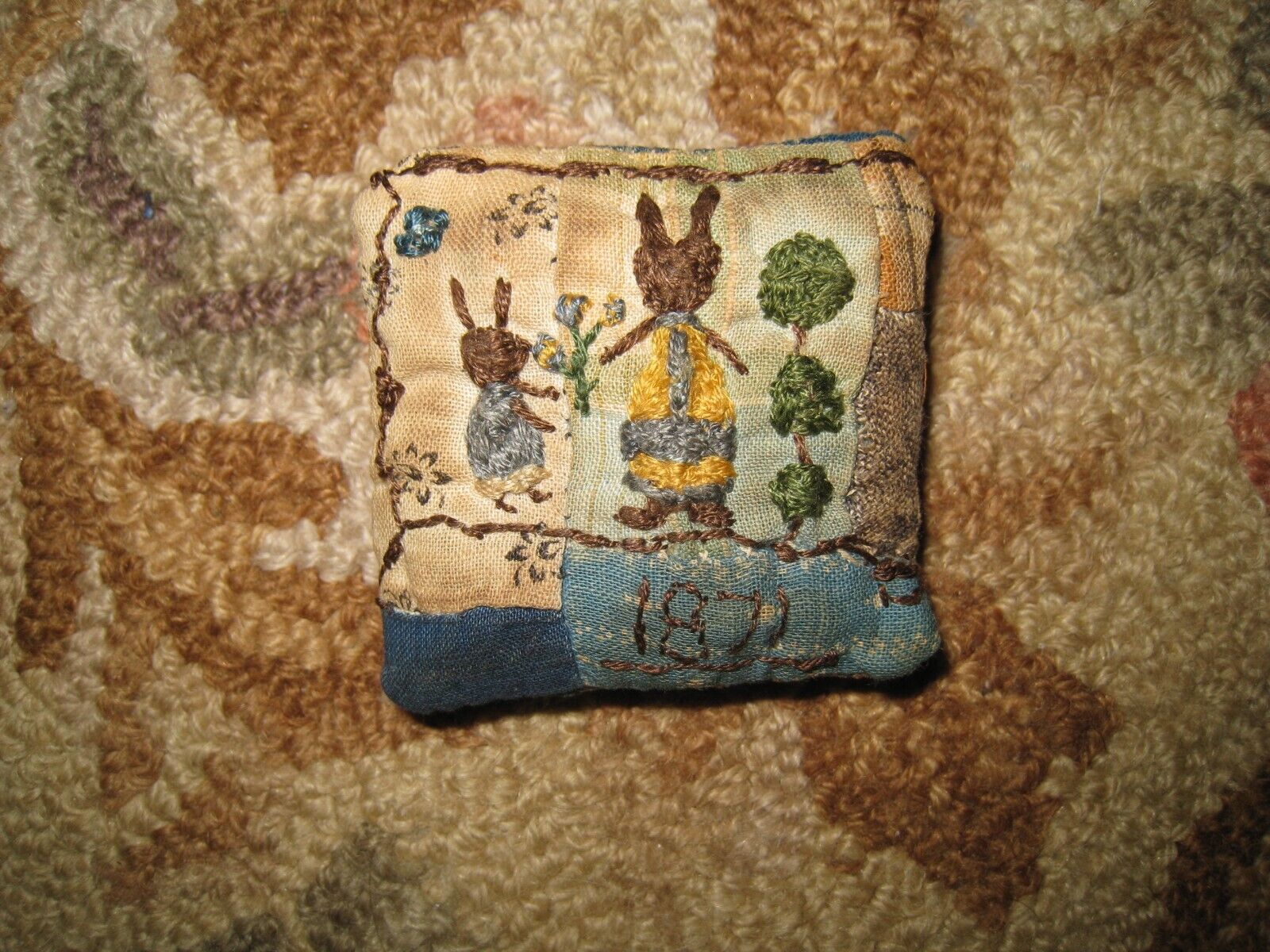 Title (ebay affiliate link): Primitive tiny Sampler Pillow1871 Rabbits in Blue Dresses Early Quilt Folk Art