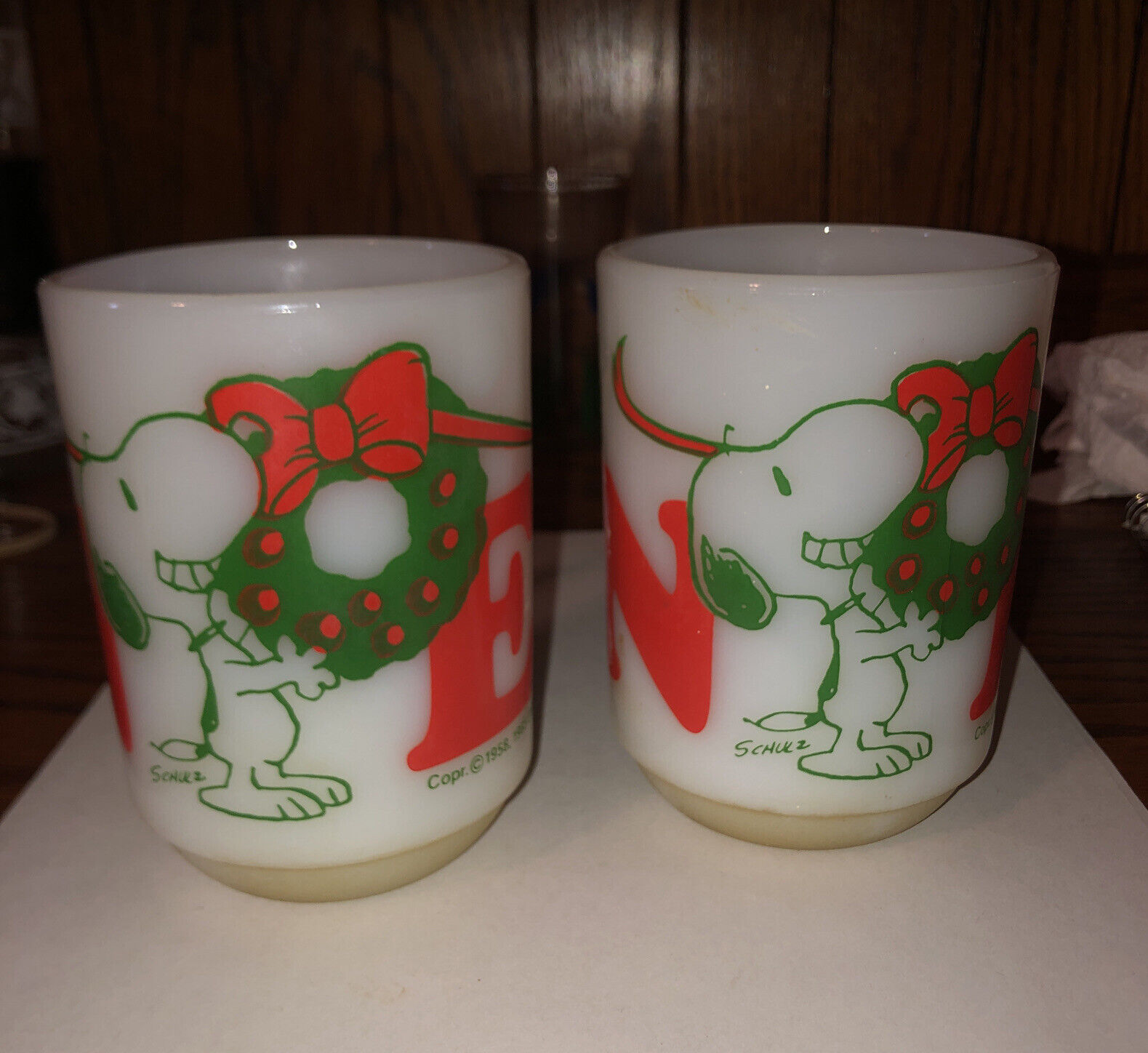 2 Fire King Snoopy Woodstock Noel Mugs Milk Glass Anchor Hocking 1965 Christmas