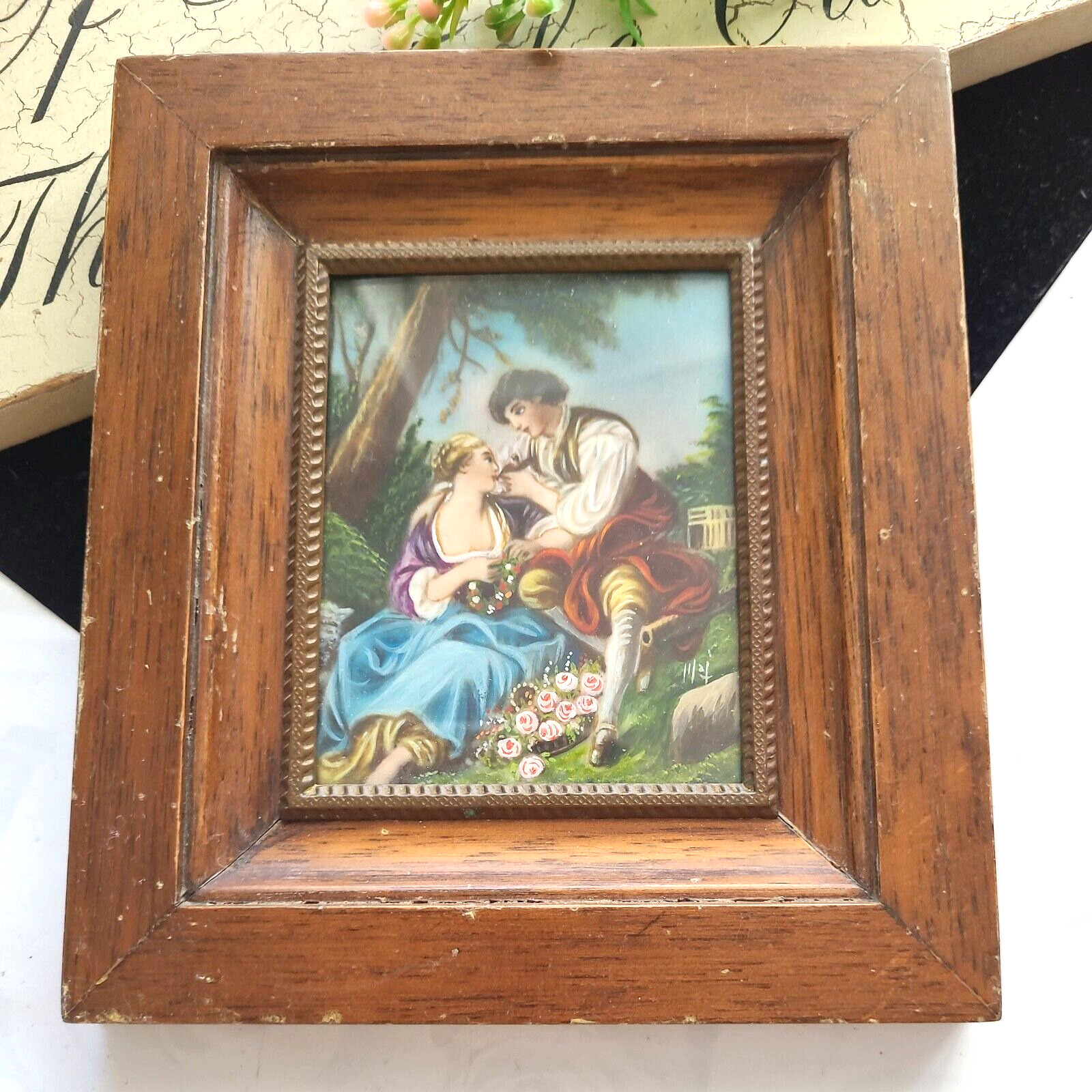 Title (ebay affiliate link): Antique European Hand Painted Miniature Romance Scene In Wooden Frame 15cmx13cm