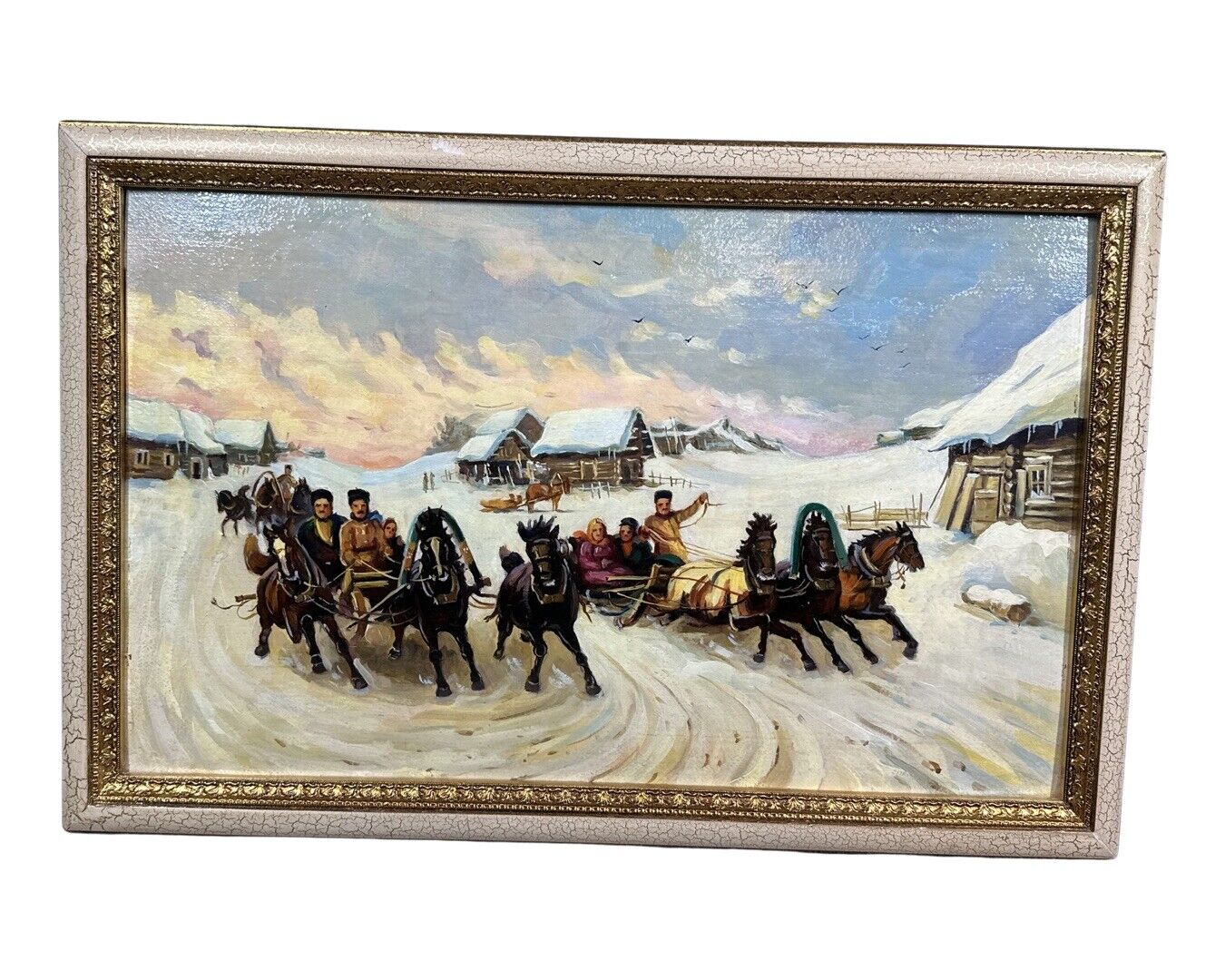 Title (ebay affiliate link): Vintage RUSSIAN Style WINTER Snow LANDSCAPE Old HORSE BUGGY Folk Art PAINTING
