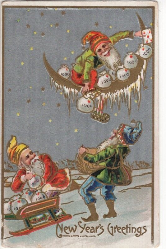 ANTIQUE EMBOSSED NEW YEAR Postcard GNOME DROPPING BAGS OF MONEY OFF MOON