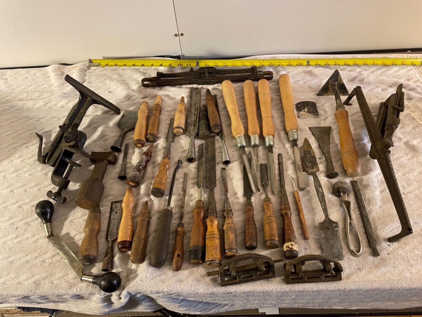 Title (ebay affiliate link): LARGE GROUP OF ANTIQUE WOOD WORKING TOOLS CHISELS AND MORE