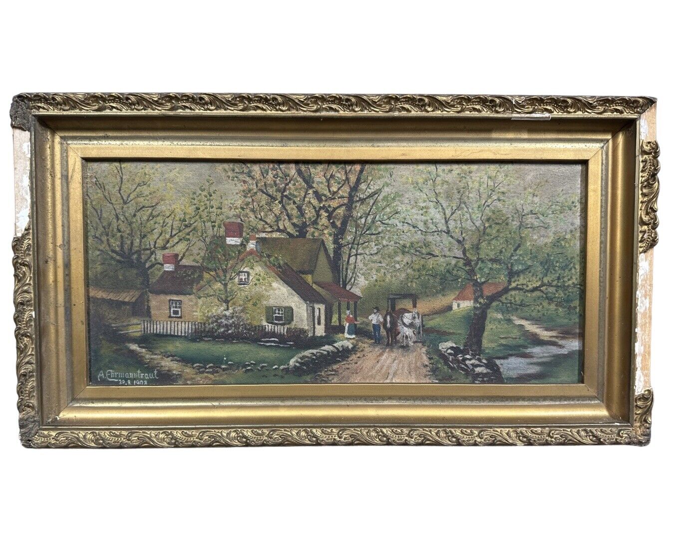 1908 Antique PRIMITIVE LANDSCAPE Old COUNTRY COTTAGE Horse Buggy OIL PAINTING