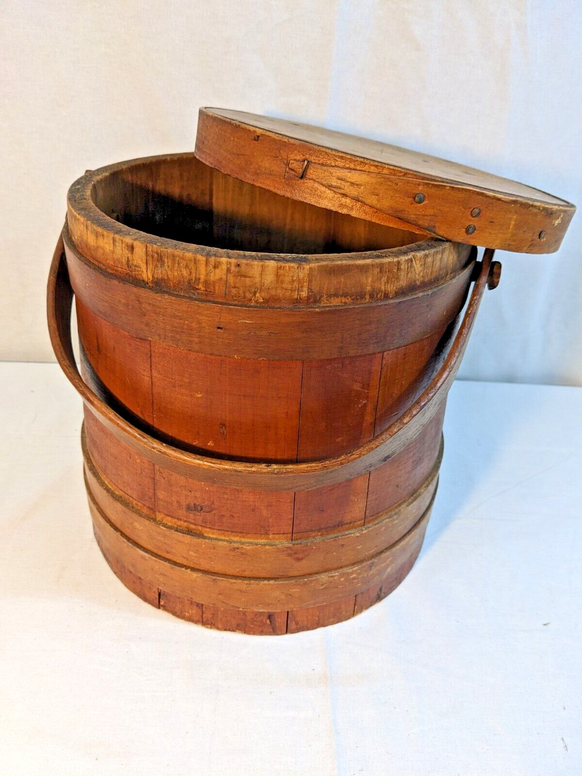 Antique PRIMITIVE Old COUNTRY BUCKET Mince Meat PAIL Lap Banded Wood FIRKIN